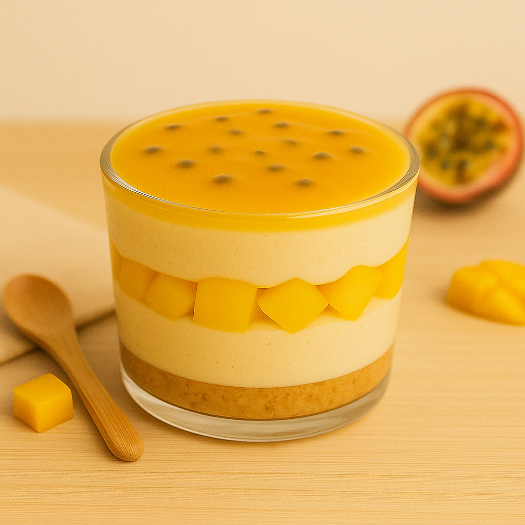 Ce Timamisu associe une crème mascarpone à la vanille, des morceaux de mangue fraîche et un coulis de fruit de la passion qui apporte juste ce qu’il faut d’acidulé. C’est doux, équilibré, et parfait quand t’as envie de fraîcheur !